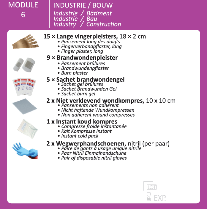Met onze branchespecifieke module Industrie/Bouw maakt u onze bedrijfsverbanddoos eenvoudig geschikt voor gebruik in een industriële omgeving of in de bouw. De inhoud bevat onder andere producten voor brandwondenverzorging zoals brandwondenpleisters en brandwondengel, maar ook een instant-koud-kompres en lange vingerpleisters.